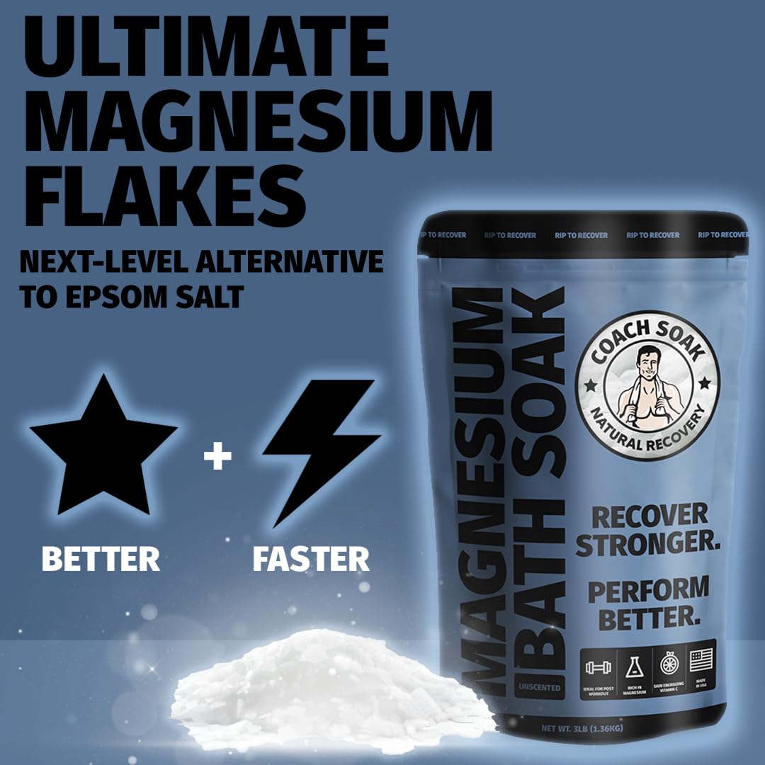 Coach Soak Recovery Bath Soak - Alternative to Epsom Salt Bath Soak - Fast-Absorbing Pure Magnesium Flakes with 21 Minerals, Bath Salts & Essential Oils - 3 lb (1 Pack) - Unscented