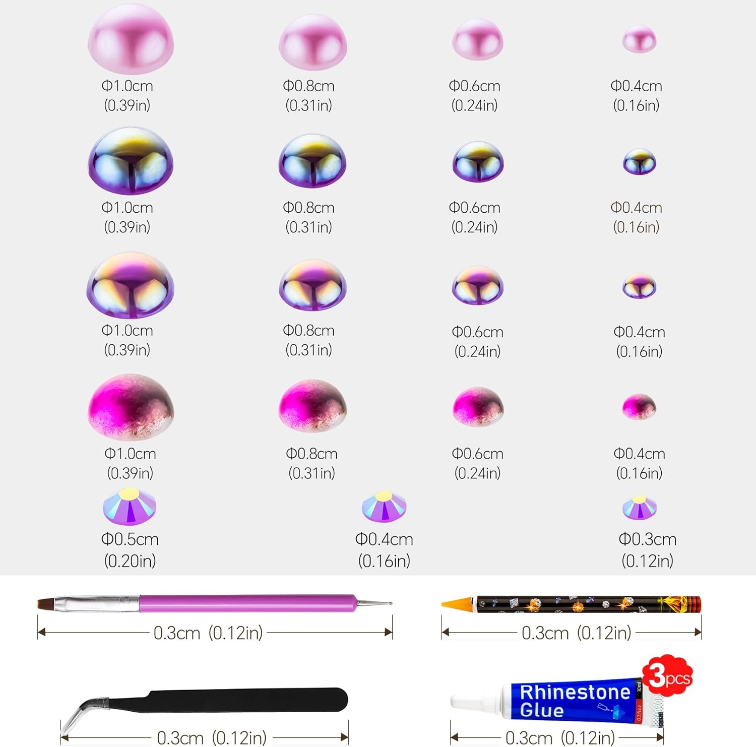 - Assortment Sizes: The flatback half pearls come in a mixture of colors and sizes of 3/4/5/6/8/10mm. The flatback rhinestones are resin rhinestones in sizes of 2/3/4/5/6mm. These mixes are such a great way to get an assortment of colors and sizes without having to buy each item individually