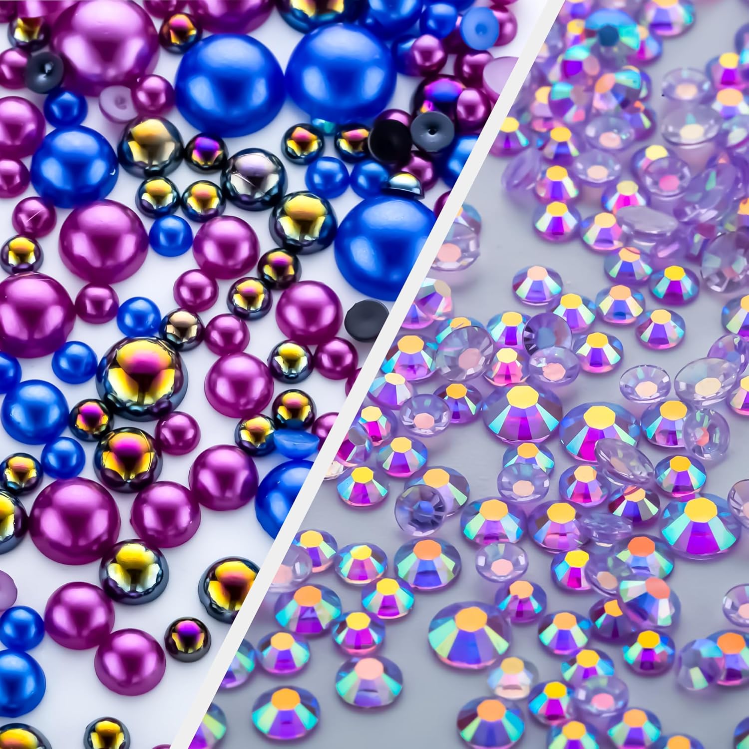 - Assortment Sizes: The flatback half pearls come in a mixture of colors and sizes of 3/4/5/6/8/10mm. The flatback rhinestones are resin rhinestones in sizes of 2/3/4/5/6mm. These mixes are such a great way to get an assortment of colors and sizes without having to buy each item individually