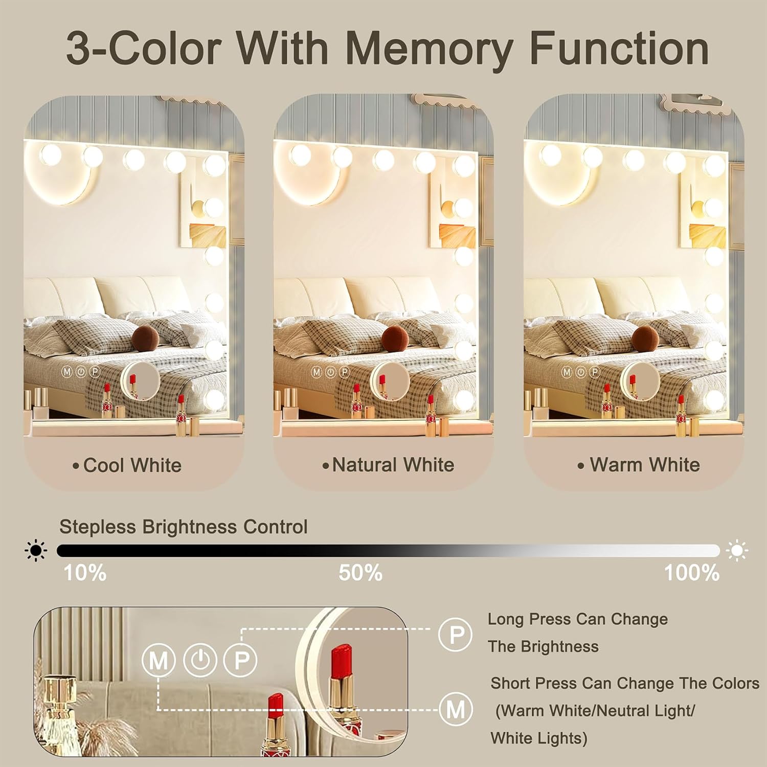 - 【Memory Function】The memory function of the makeup mirror helps you remember your habits. When you adjust a certain light to the desired brightness, the next time you turn on the light, it will remember your habits for you.