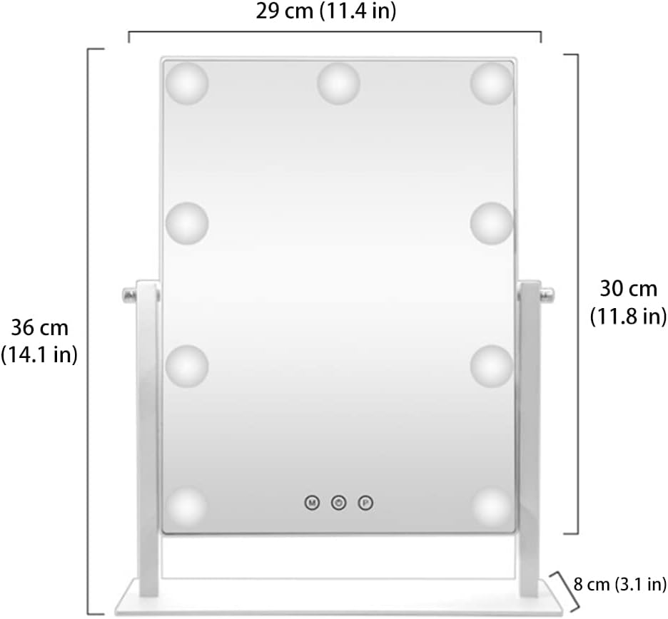 - Three different light colors: 9 big bulbs lights providing a large and bright viewing, adjustable brightness and 3 lights color modes(day light(5500K), cold light(7800K), warm light(4000K)), helping you to finish a flawless professional makeup suitable for any occasions