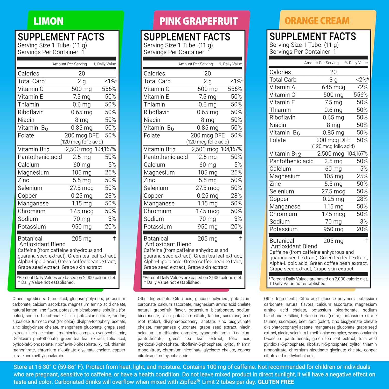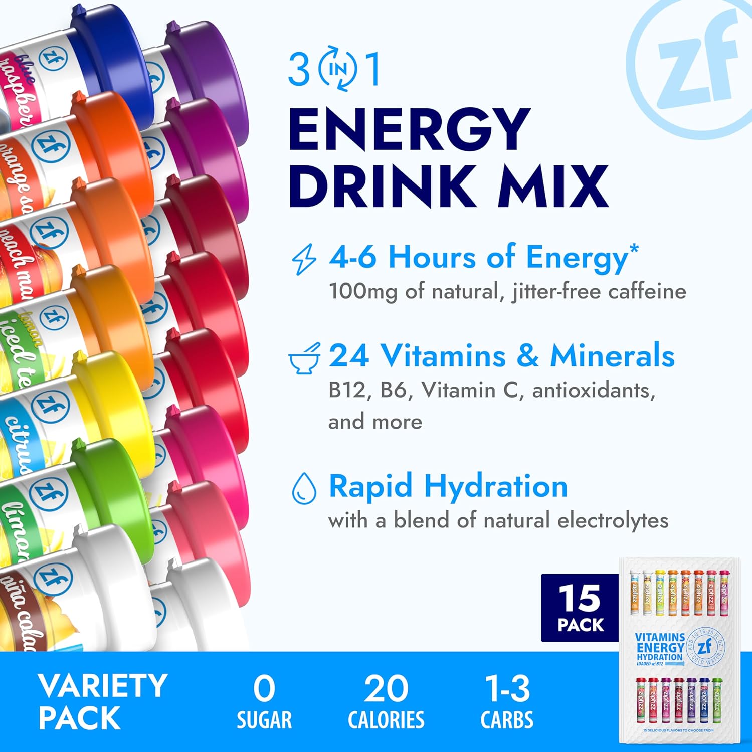 - 3-in-1 Daily Functional Beverage β Zipfizz Energy Drink Powder combines natural ingredients to deliver sustained energy, liquid electrolytes, and immunity support in one sugar-free, low-carb, and low-calorie daily bubbly beverage.