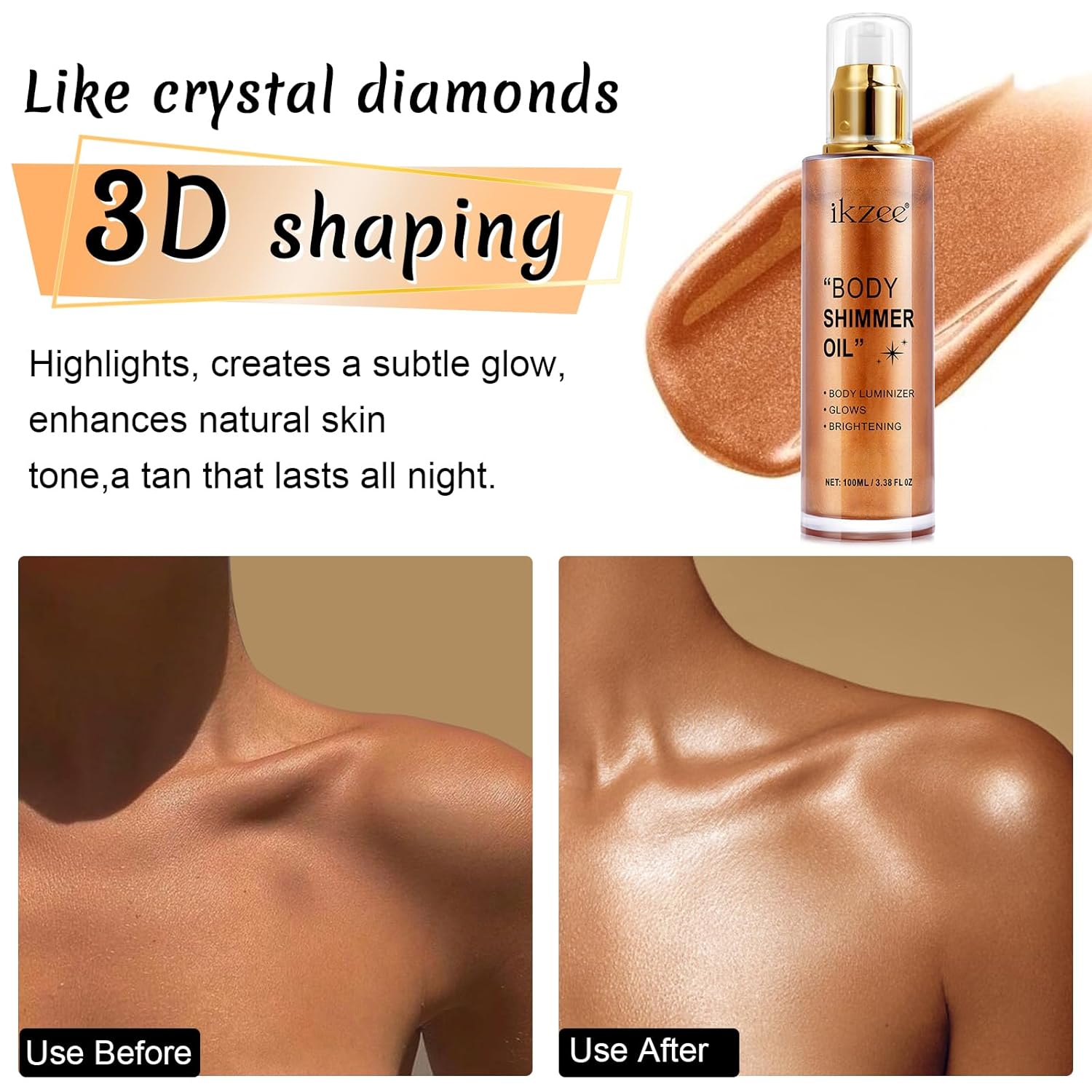 - ⦠SHIMMERING BODY GLOWING LUMINIZER -- This shimmer body oil brightens your complexion, the flecks of shimmer catch the light and make your skin glow, giving your skin an attractive shimmer in the sun, giving you a more natural and healthier complexion.