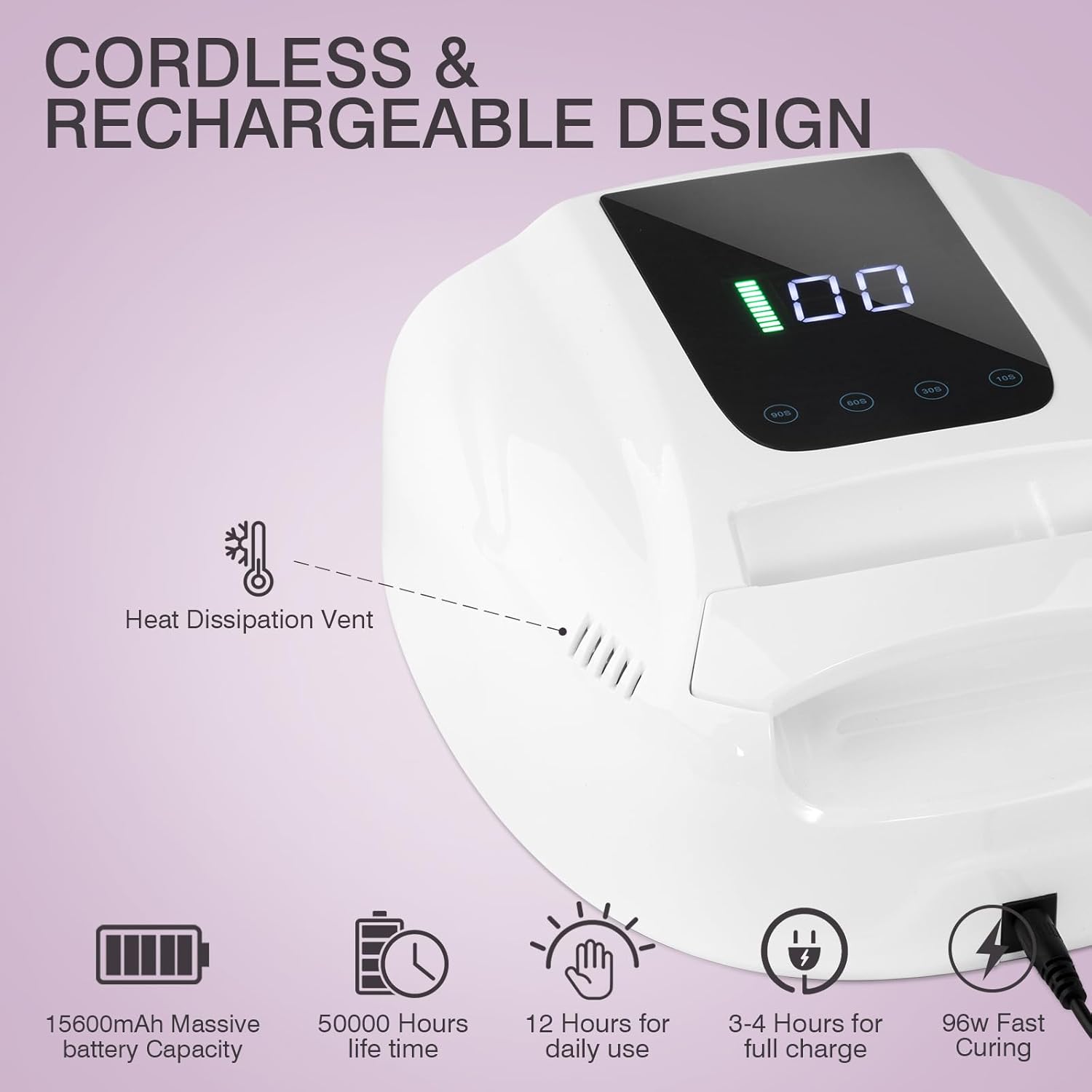- 【Efficient UV light】boasts 96W 42 LED beads for fast, curing gel evenly and deeply. The rechargeable 15600mAH battery offers 12 hours of working time with 3-4 hours of charging.