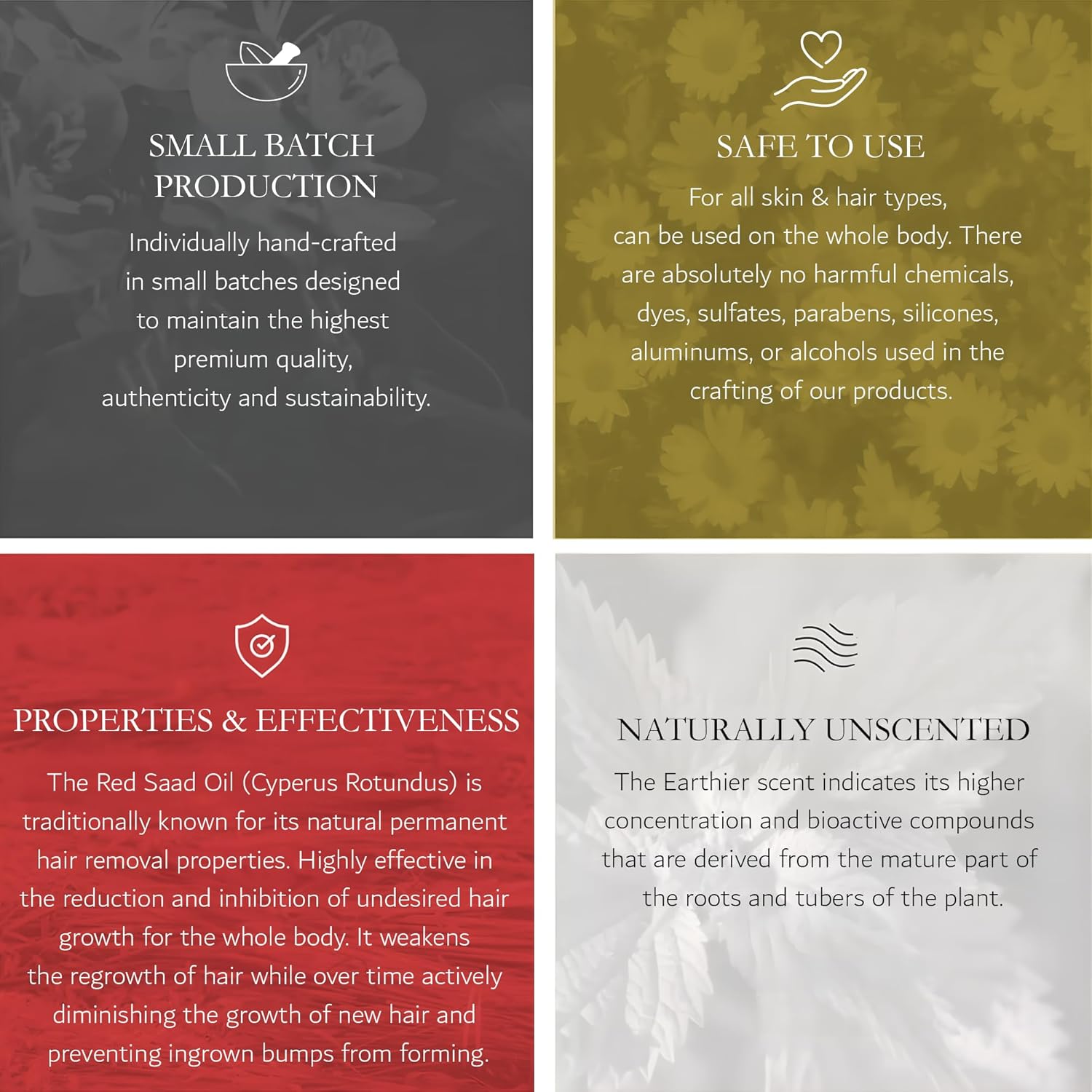 - COLOR AND CONCENTRATION COMPARISON: Silky Serum Unscented (Egyptian Cyperus Rotundus) uses 100% pure organic red saad oil along with organic argan, jojoba, grape seed and vitamin E oils, purest on the market. It has a darker, stronger and richer reddish-brown color with a STRONG earthy black pepper scent indicating its high concentration. Commonly mistaken with Yellow Saad Oil (Cyperus Esculentus) retaining a more golden hue and milder scent. Known for its moisturizing and nourishing skin/hair care properties and is not for hair removal (don't be misled by trending imitations).