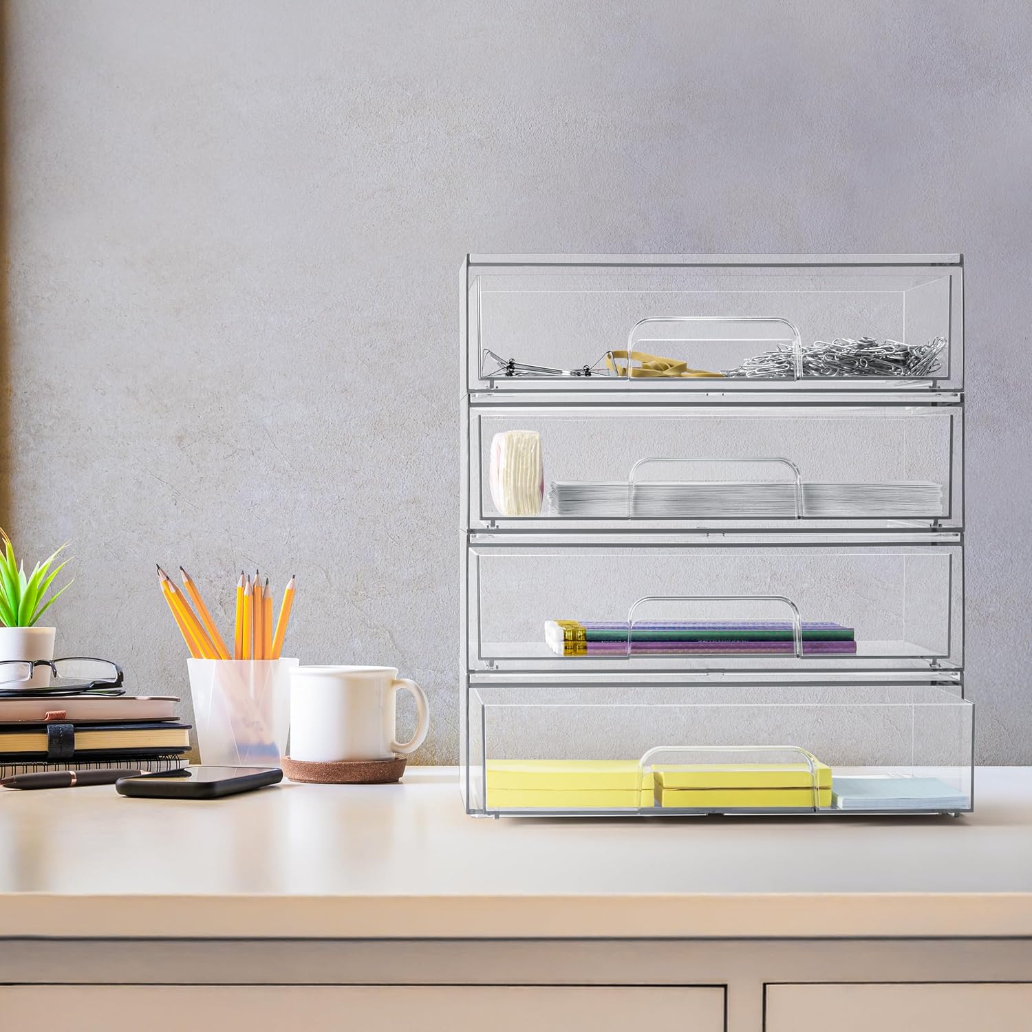 - Pull-Out Drawers with Built-In Handles: Easily access cosmetics, skincare, cleaning products, pantry items, makeup, crafts, office supplies, and more. Acrylic drawer organizer features smooth-gliding drawers designed for convenience. Organize countertops, under the sink, cabinets, closets, vanities, and more.